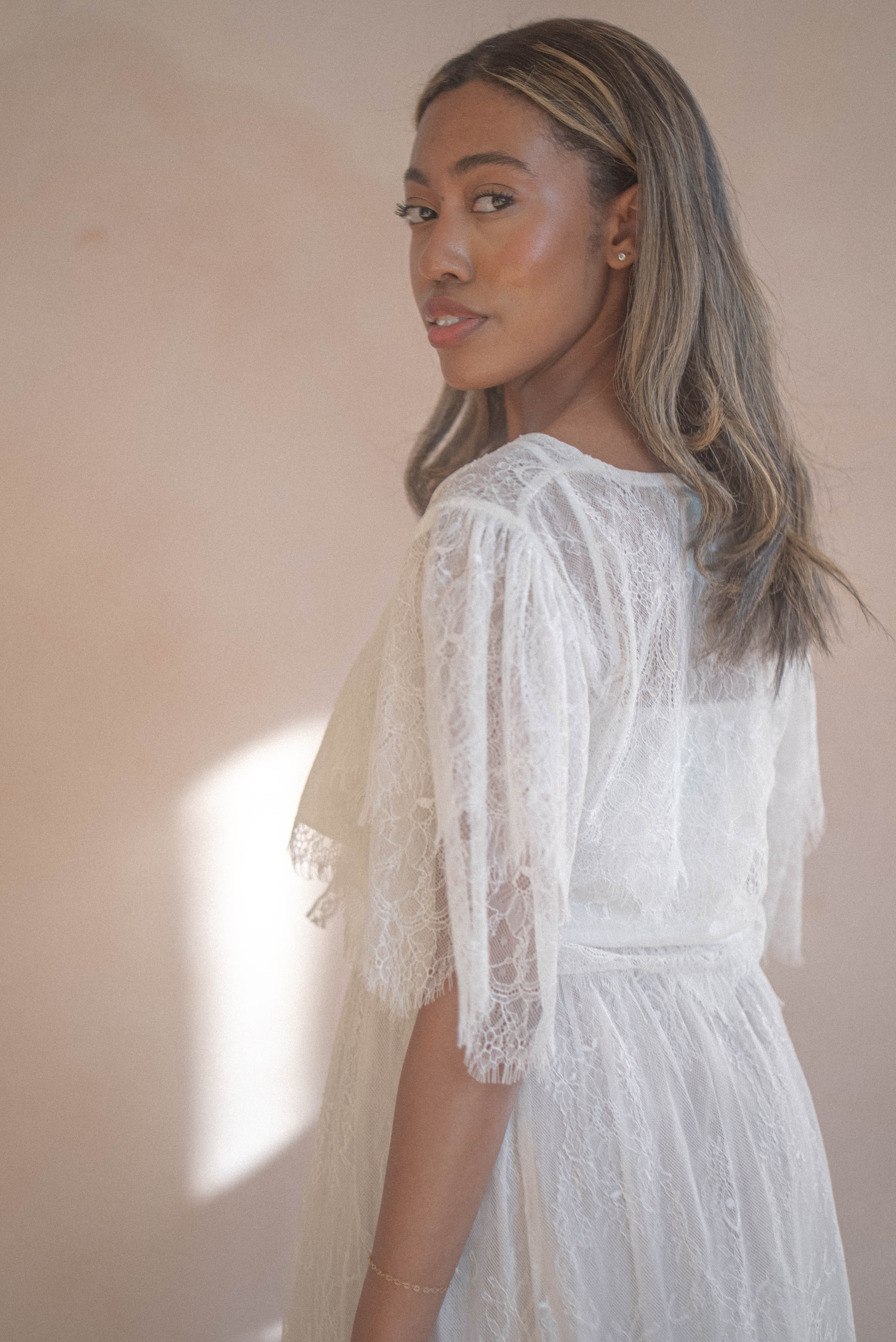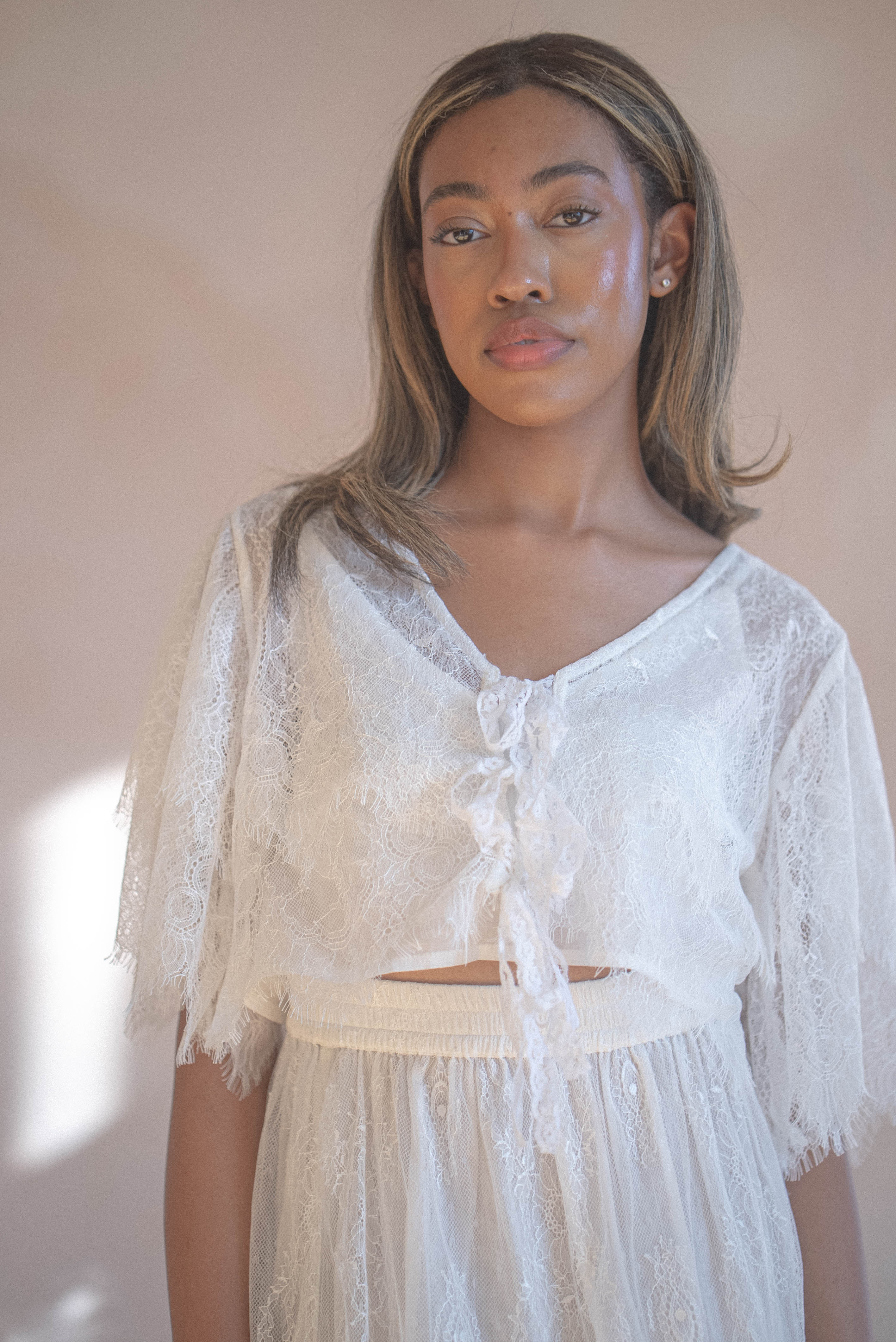Romantic, refined, and effortlessly wearable, the Mona top is your new go-to for warm-weather styling. This delicate blouse features a charming front-tie design, lace detailing, and subtly scalloped sleeves that add a whisper of femininity. Ideal for garden parties, brunch dates, or layered under a blazer for the office, the Mona Top blends romantic textures with modern versatility.
