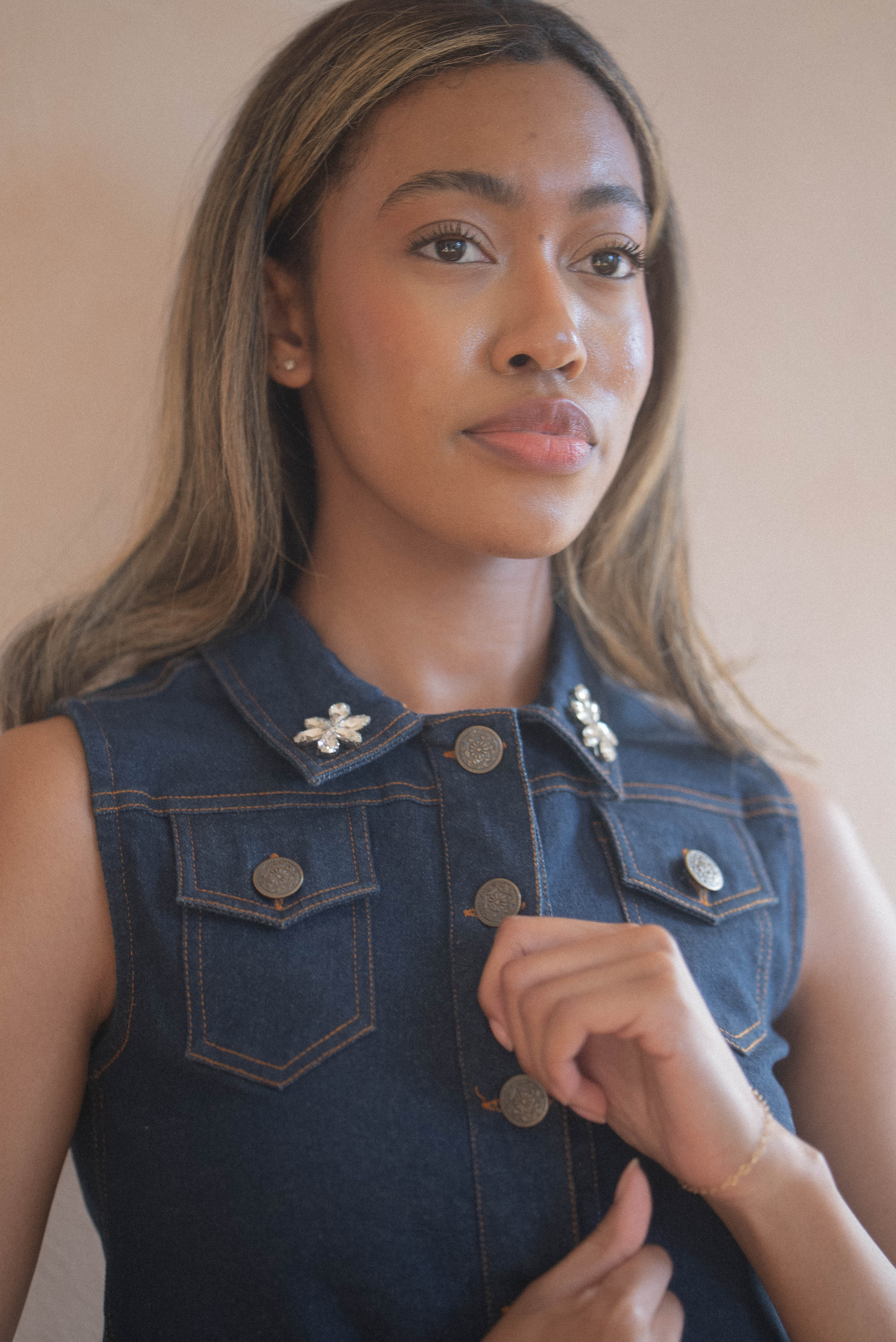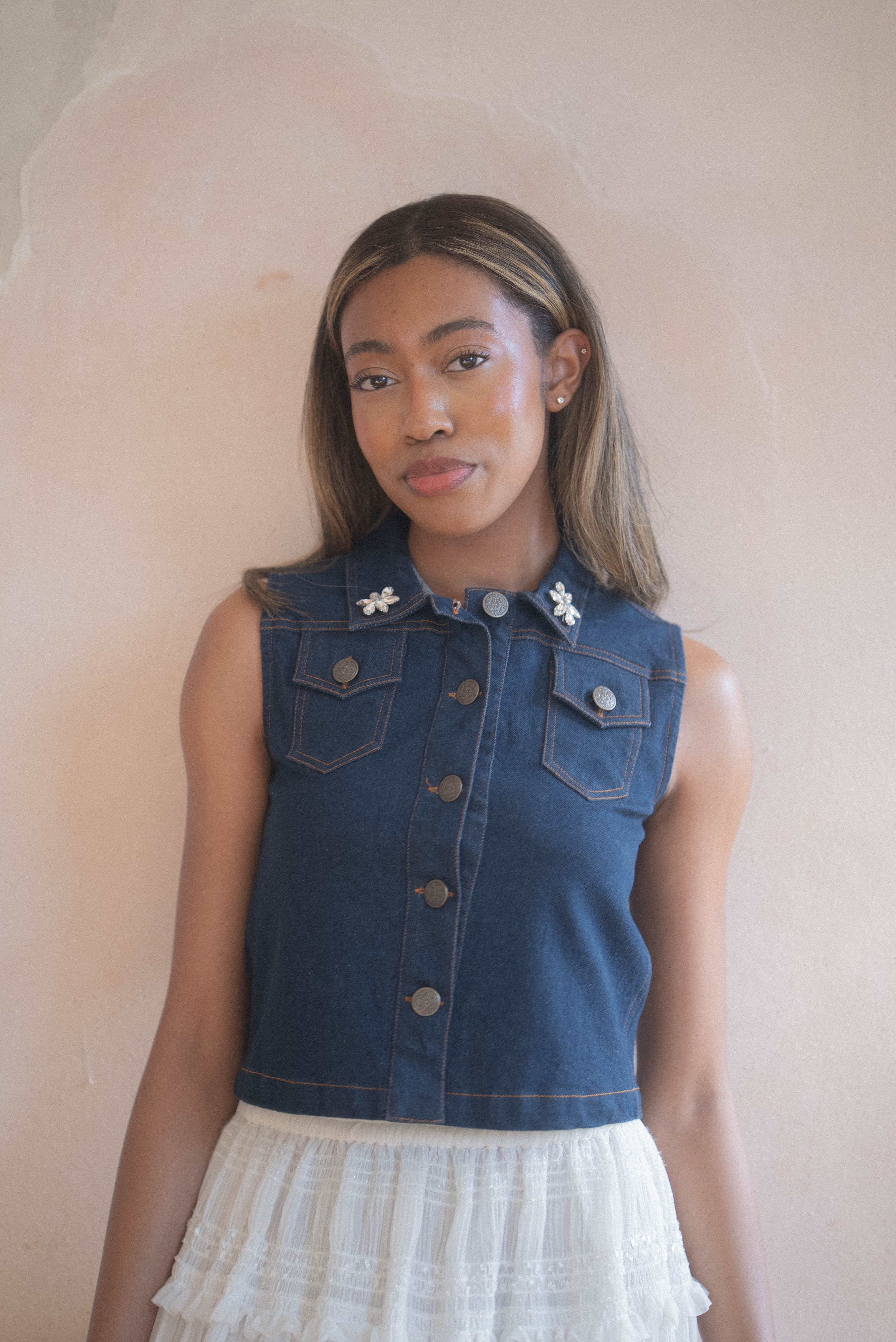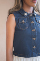 The Giselle Blouse in Denim is a modern take on a classic sleeveless top, elevated with sparkling pavé embellishments along the collar for a subtle touch of glamour. Its slightly cropped silhouette offers a flattering fit that pairs effortlessly with high-waisted jeans, skirts, or tailored trousers. Crafted from premium denim, this blouse is both structured and comfortable, making it a versatile piece for day-to-night styling. Whether styled for a casual outing or a chic evening look, the Giselle Blouse in Denim brings effortless sophistication and refined elegance to any wardrobe.