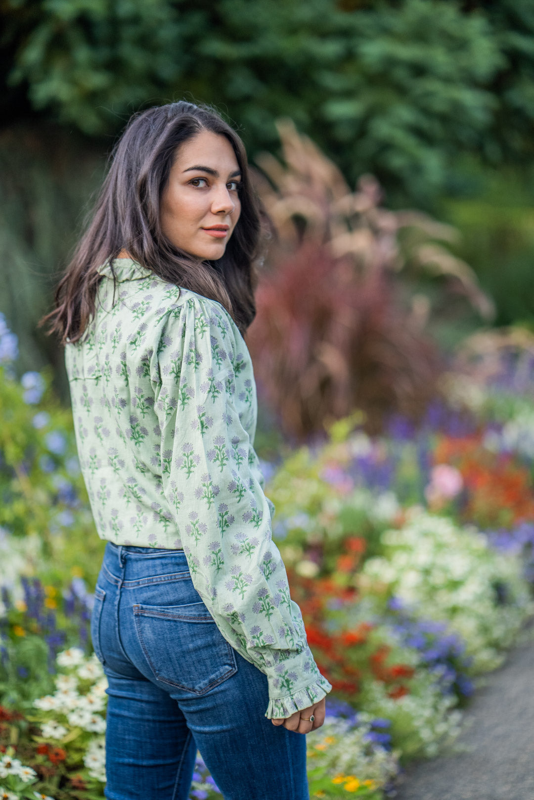 Available in Green Graciosa, this hand block print blouse with ruffles is the solution to your wardrobe woes. Teresa is a flowy, cotton blouse with functional shell buttons up the front and long, button-cuff sleeves. Cute ruffles at the neck and cuffs give Teresa a splash of personality. Wear it tucked in to show off a stylish belt or untucked for loose and carefree styling.