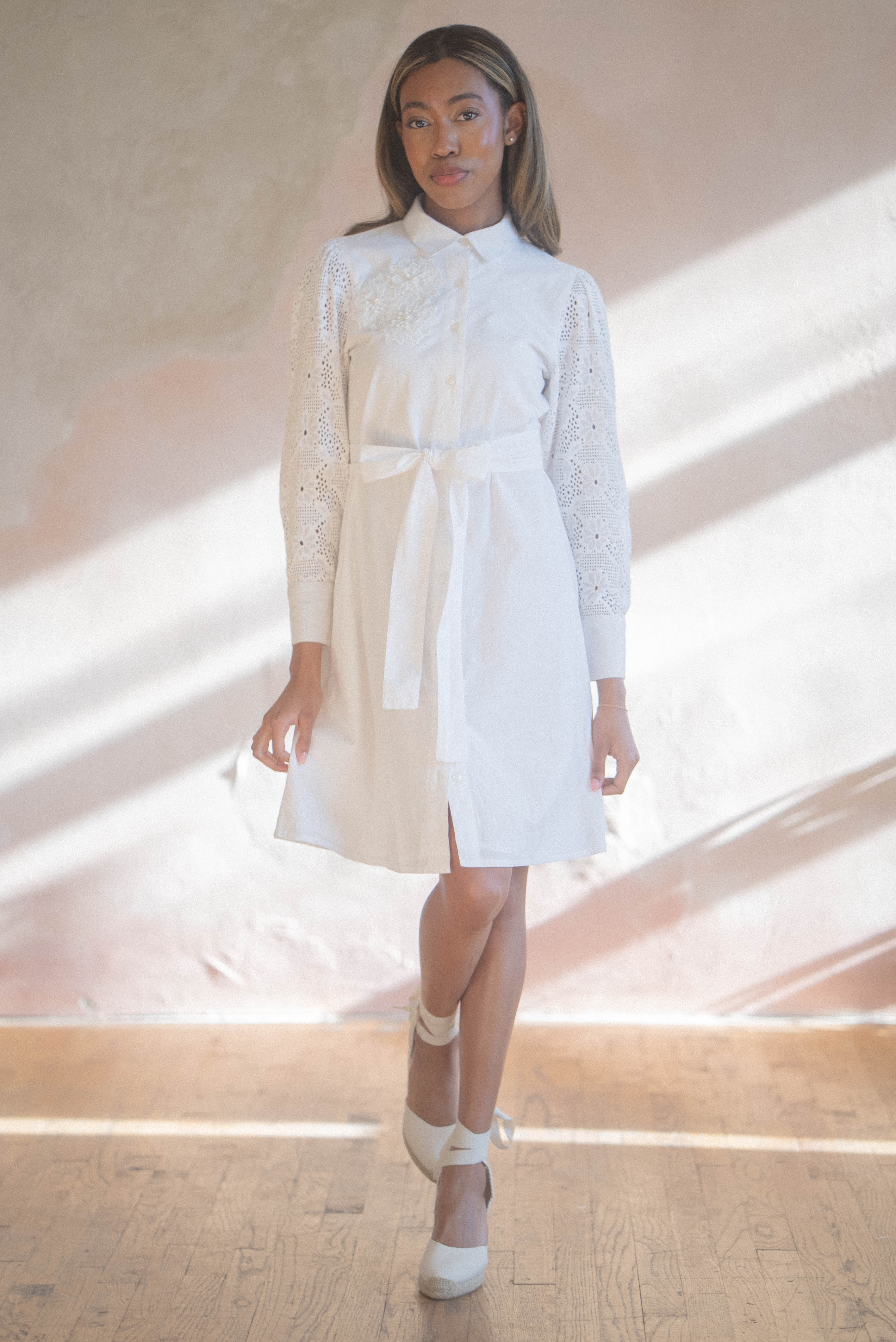 The Natalie Shirt Dress is the perfect addition to your wardrobe for any occasion! Made from a soft and breathable cotton material, this dress is designed to keep you comfortable and stylish all day long. The eyelet detailing on the bodice adds a touch of feminine charm, while the flattering silhouette creates a beautiful flowy effect as you move. This dress also comes with a matching belt!