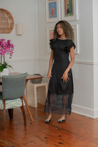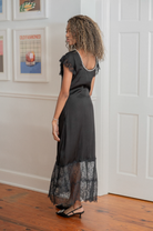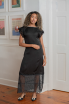 PRE-ORDER: SCARLETT CAP SLEEVE EMBELLISHED SATIN AND LACE DRESS | NOIR