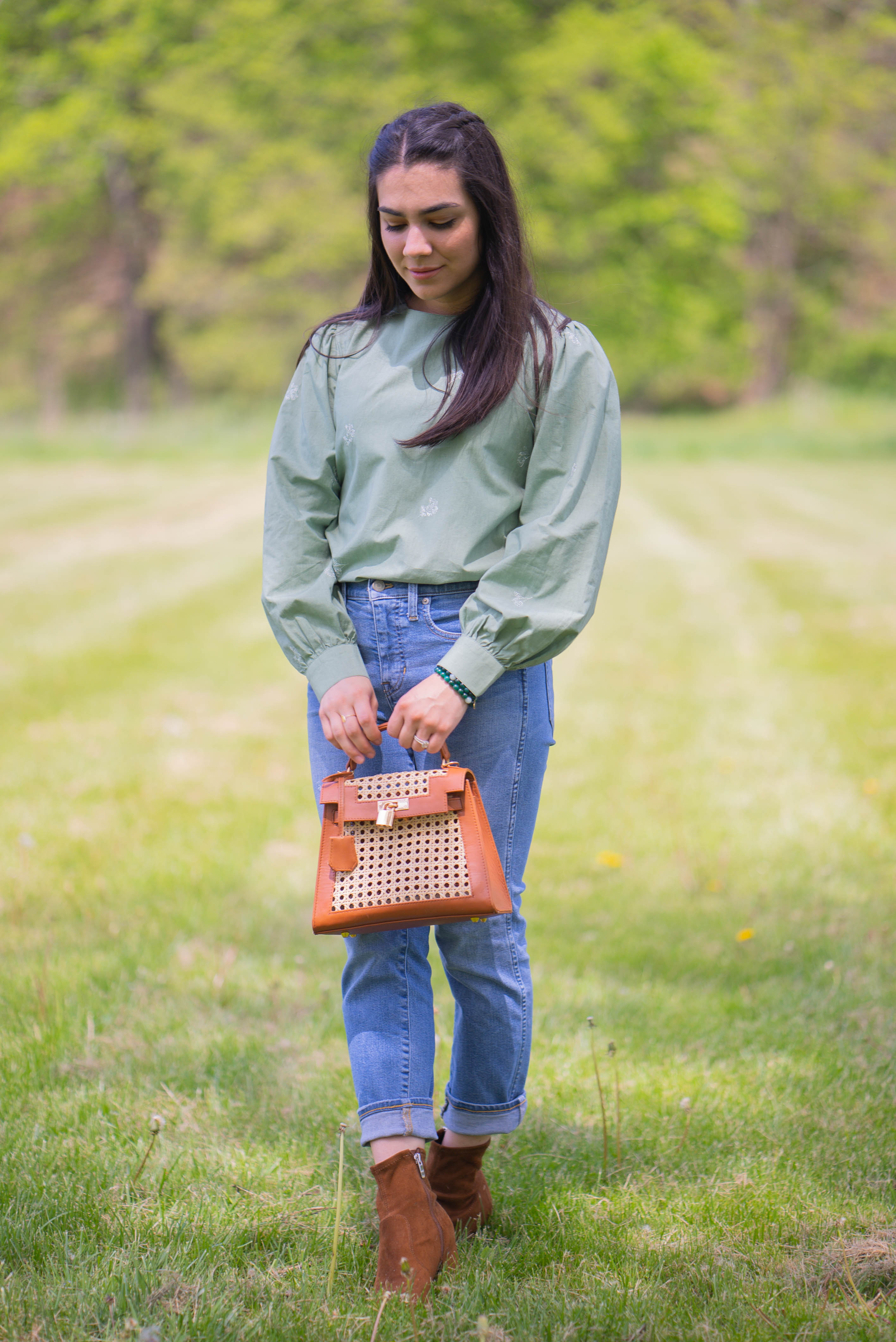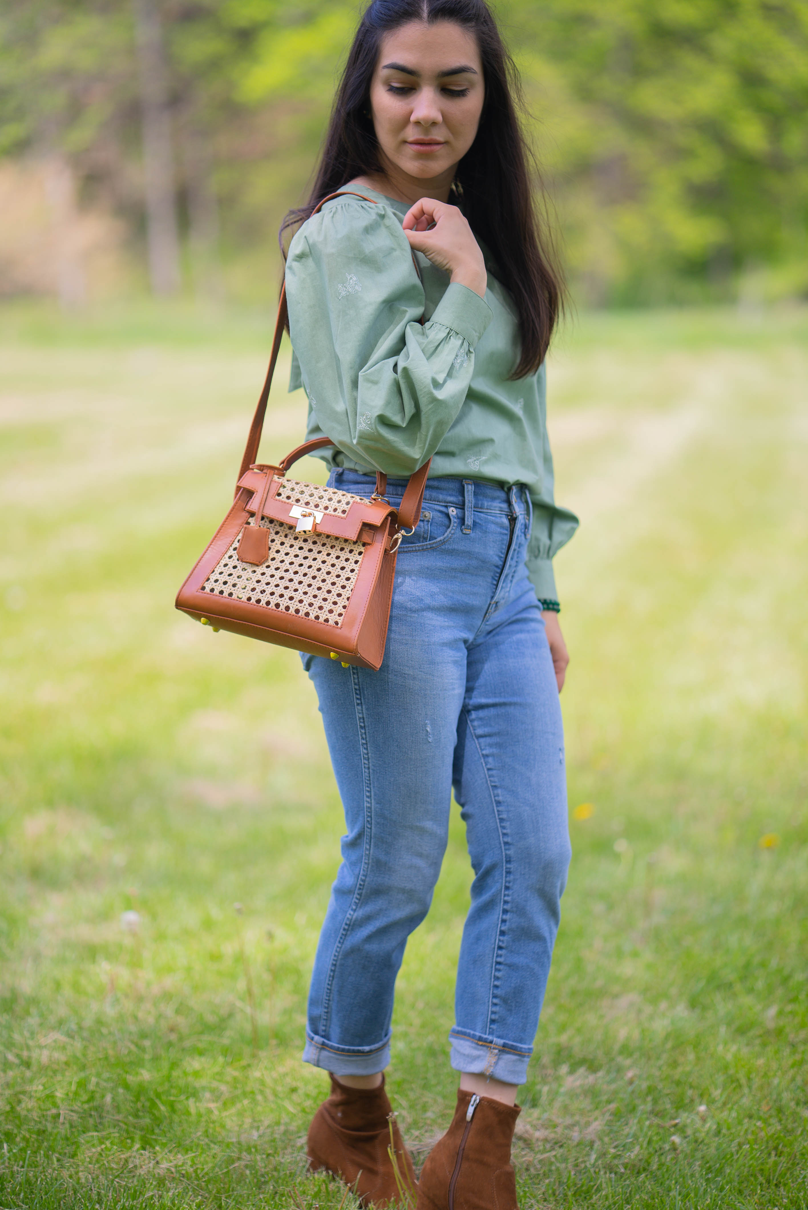 Our Maya rattan and leather trim handbag is a classic fun way to complete any look this season. Our handbags are all handmade. Want to add a little something special to your handbag? Accessorize with our 100% silk scarves.