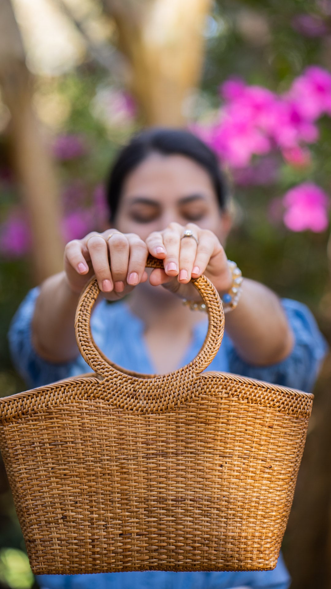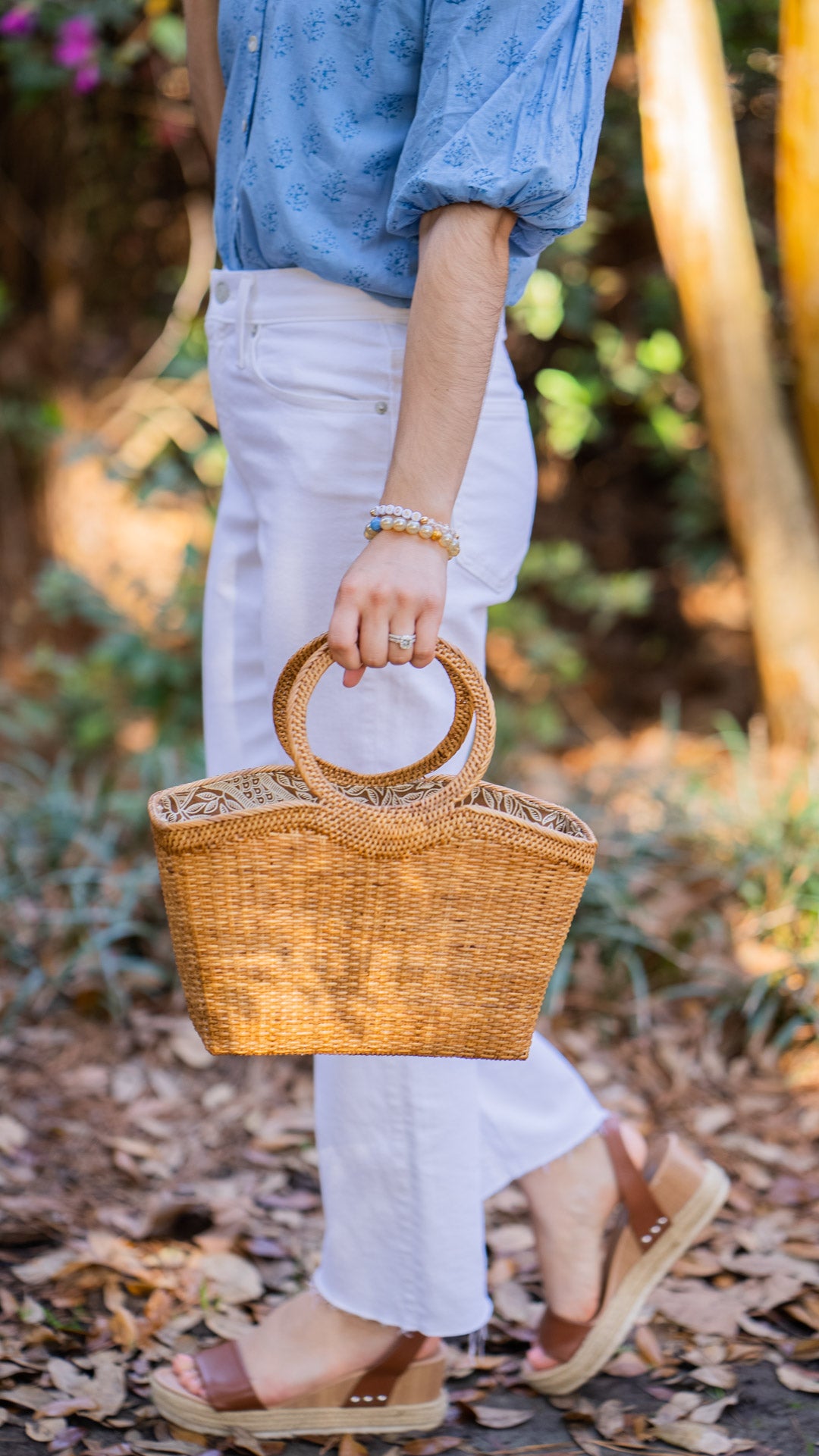 Rattan handbags are such a classic fun way to complete any spring and summer look. Our rattan handbags are all handmade. Inside is a beautiful timeless 100% floral cotton lining, and with a drawstring closure that is complimented with wooden beads. Want to add a little something special to your handbag?