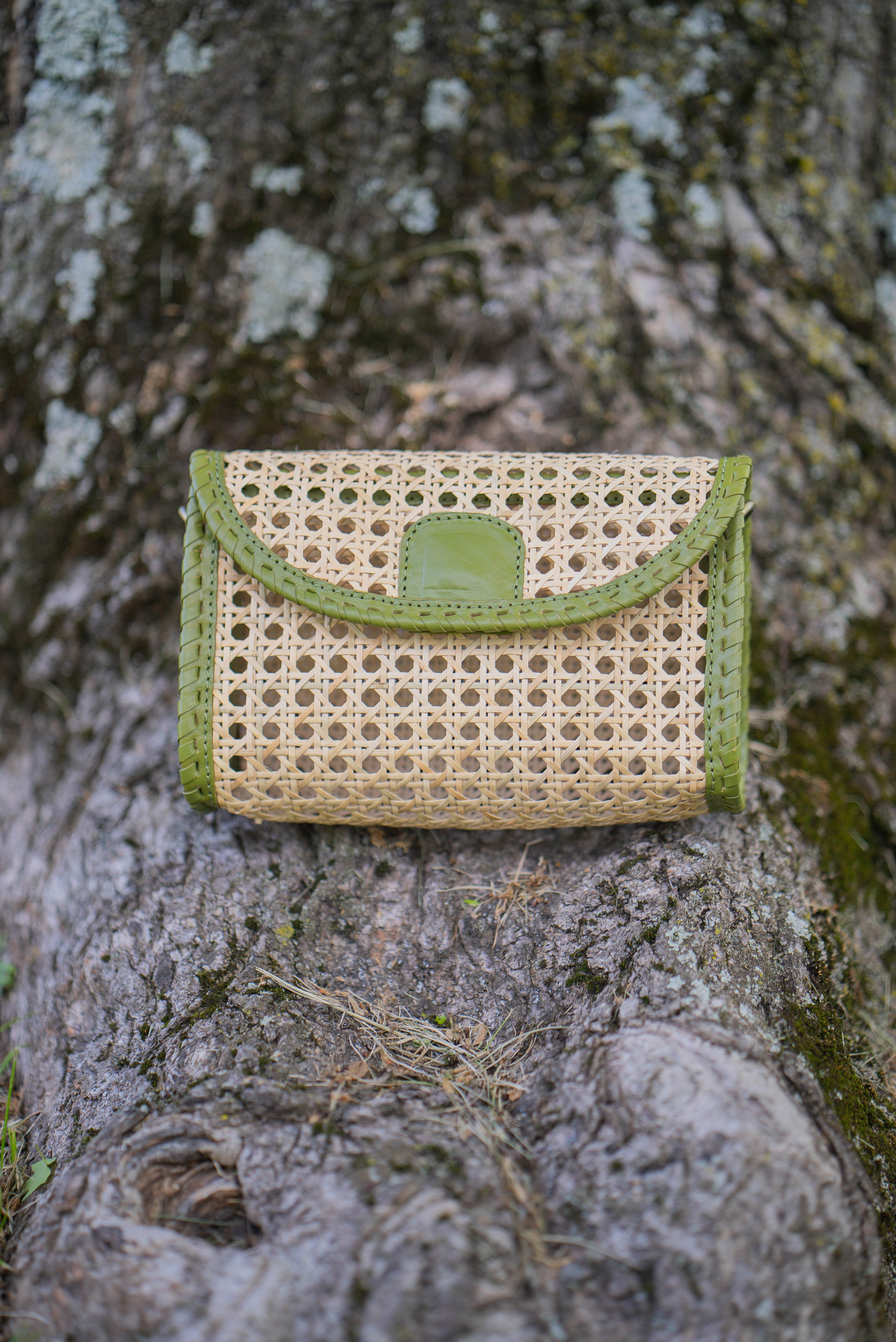 SOLANGE RATTAN AND LEATHER TRIM CLUTCH | GREEN