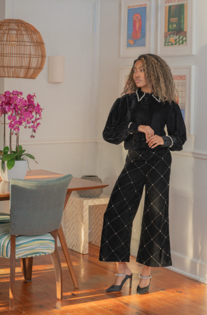 PRE-ORDER: ELOISE WIDE LEG VELOUR PEARL EMBELLISHED PANT | BLACK TWILIGHT