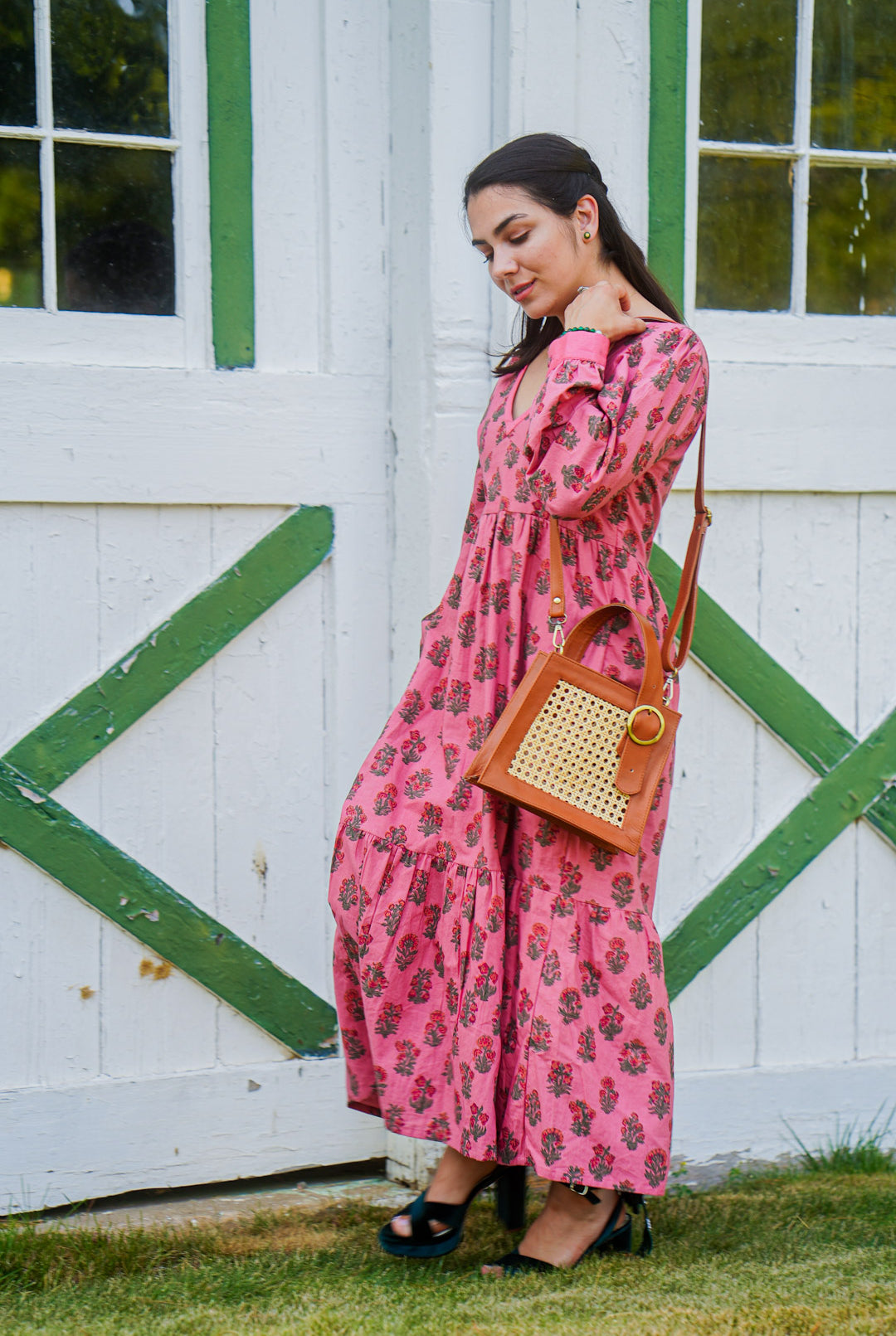 Maria is the must have blouse with feminine flair. Available in our new hand block print, Rainha. This button-up blouse is accented with pleats that are edged with delicate lace, and ruffles at the cuffs and collar. Feel pretty in pink in our Maria blouse this season.