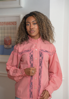 This blouse featuring ruffles and delicate lace is the solution to your wardrobe woes. Teresa is a flowy, cotton blouse with functional buttons up the front and long, button-cuff sleeves. Cute ruffles at the neck and cuffs give Teresa a splash of personality. Wear it tucked in to show off a stylish belt or untucked for loose and carefree styling.