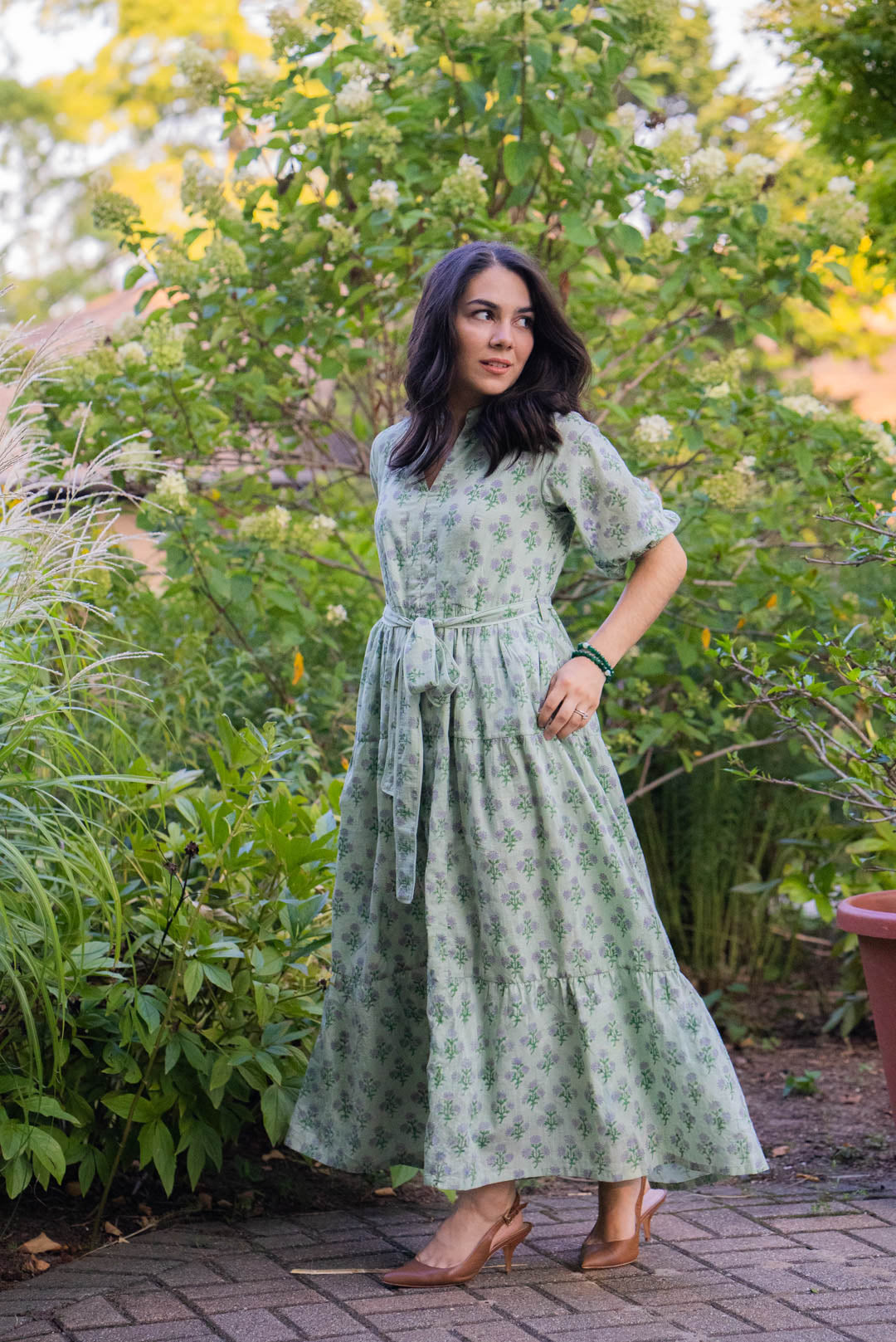 There is hardly an easier way to get dressed in the morning than to slip into our Clara Dress. Clara is a slip-on dress in our Graciosa block print pattern. Complimented with pockets, a long piped sash and a free flowing tiered skirt. Delicate ruffles on the bottom of the dress and elastic puff sleeves add extra-special feminine detailing to this comfy, casual dress.