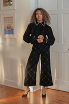 PRE-ORDER: HEATHER CLASSIC FIT WITH PEARL AND PAVE EMBELLISHMENT VELOUR BLOUSE | NOIR