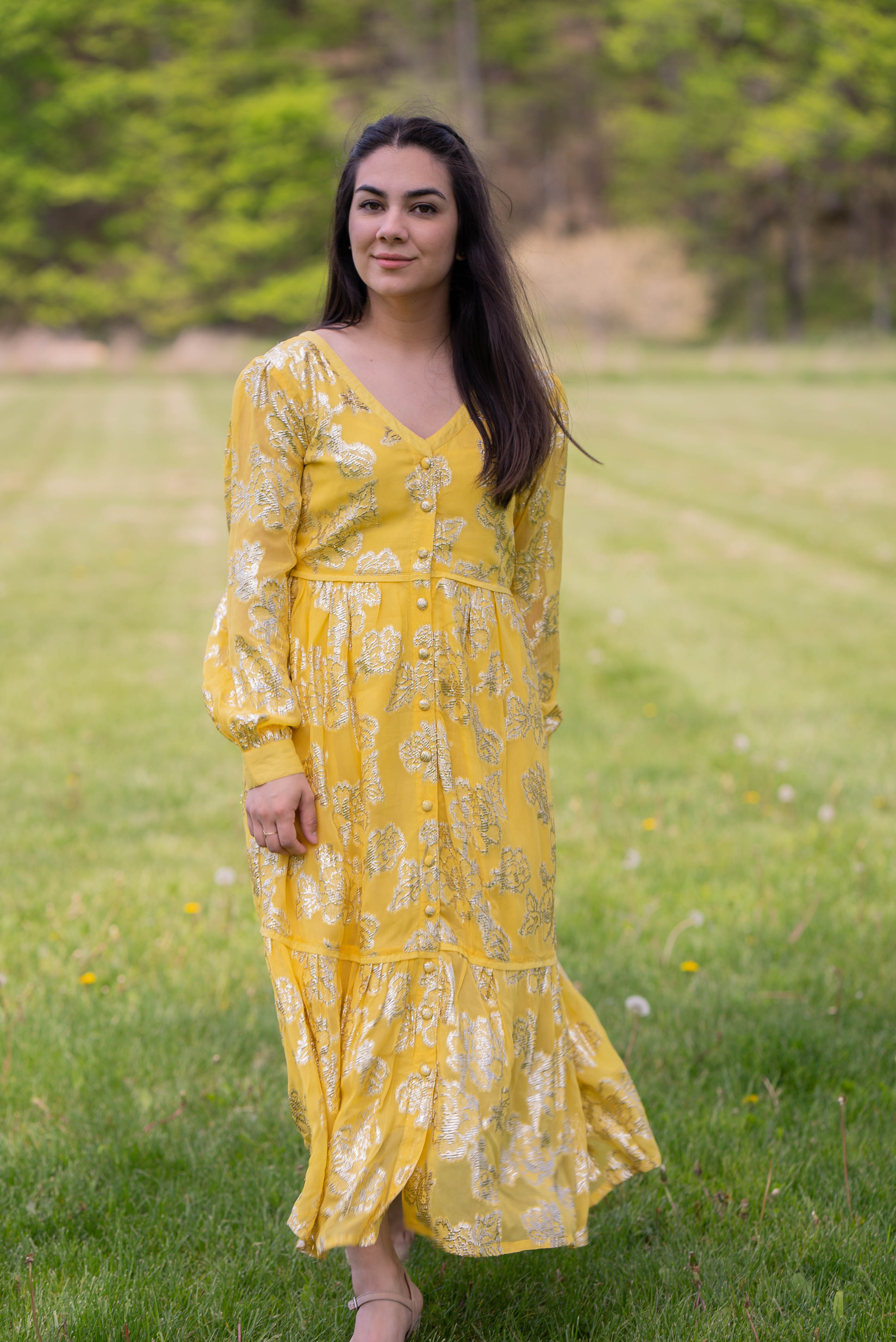 The Angelica dress features long sleeves and a classic midi length, exuding sophistication with a touch of contemporary charm. Its frontal button detail adds a timeless element to its design, making it perfect for both casual outings and special occasions. Crafted from 100% cotton, it guarantees superior comfort and breathability, ensuring you feel at ease and stylish throughout the day. Choose between two captivating variations, the Dandelion Hand Block Print, which brings the beauty of nature to your wardrobe with its whimsical design, or the Yellow Petunia in a new metallic sheer fabric, a radiant choice that adds a touch of shimmer and allure to your ensemble.