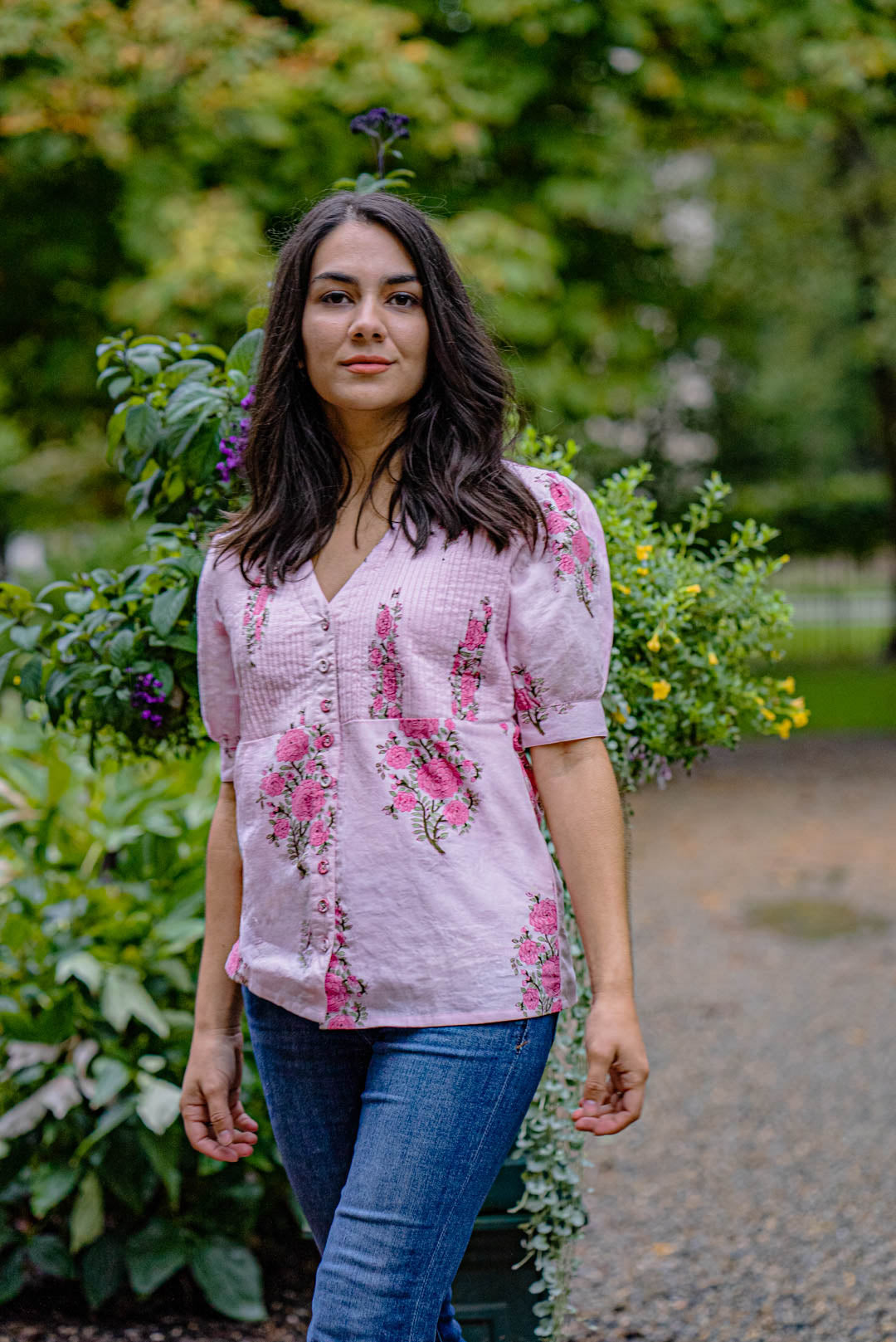 CECILIA V-NECK BLOUSE WITH PUFF SLEEVES | PEONY