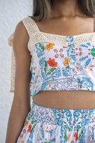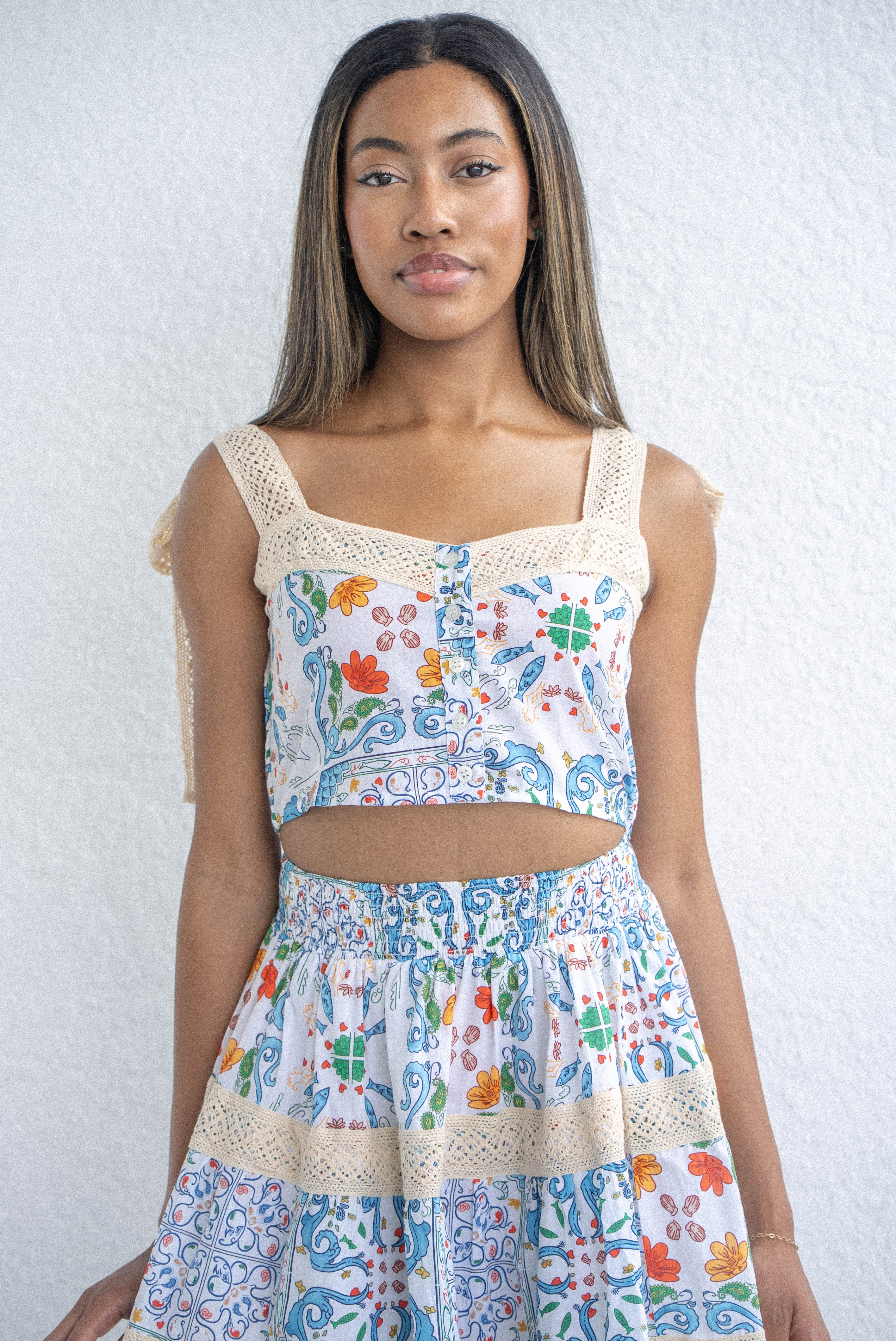 Functional front buttons add versatility and charm, while a smocked back ensures comfort and flexibility without sacrificing structure. The adjustable crochet tie straps allow for a customizable fit and add a soft, romantic finish. Cropped just right, the Waverly Top pairs perfectly with high waisted skirts, tailored trousers, or your favorite denim for an elevated everyday look.