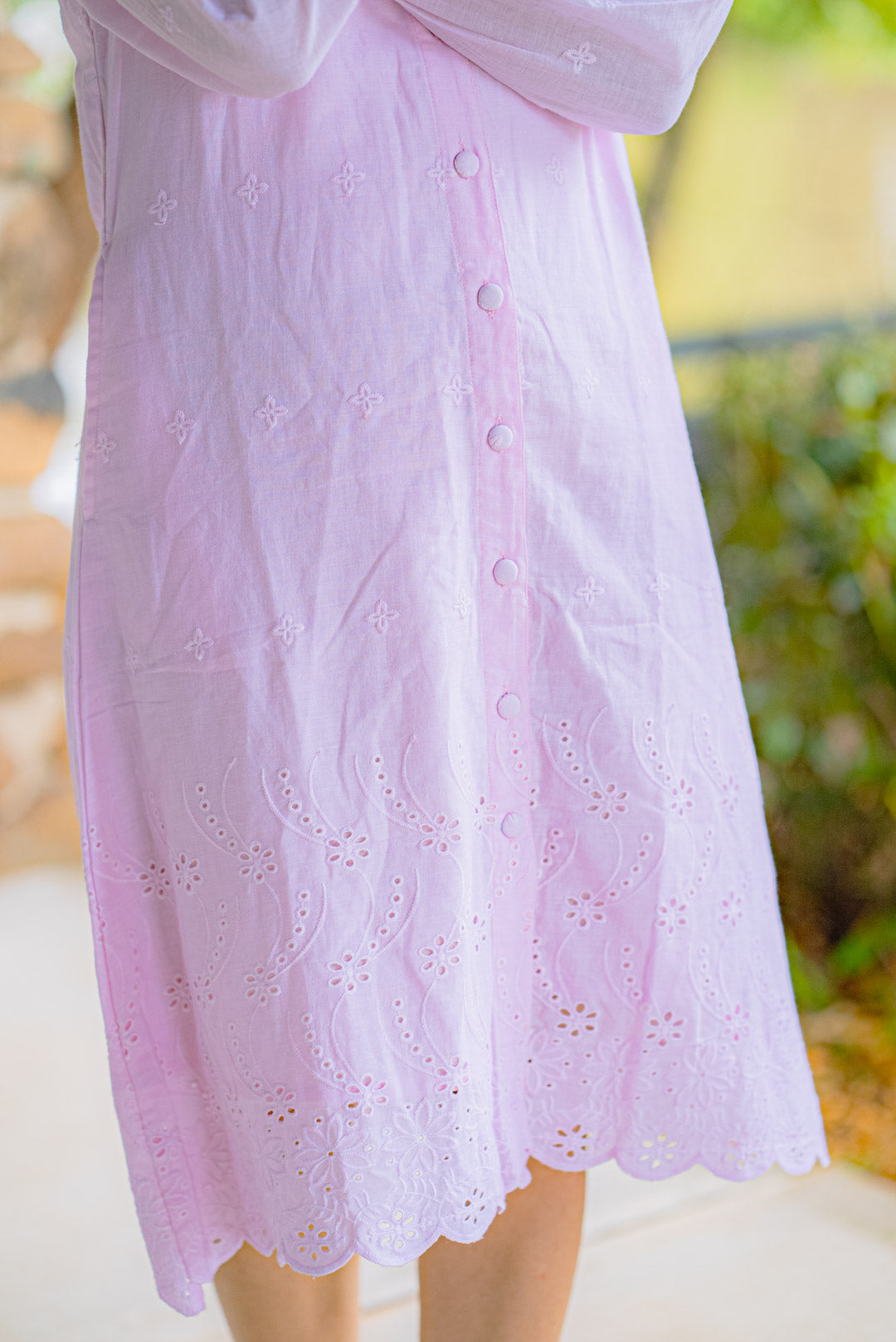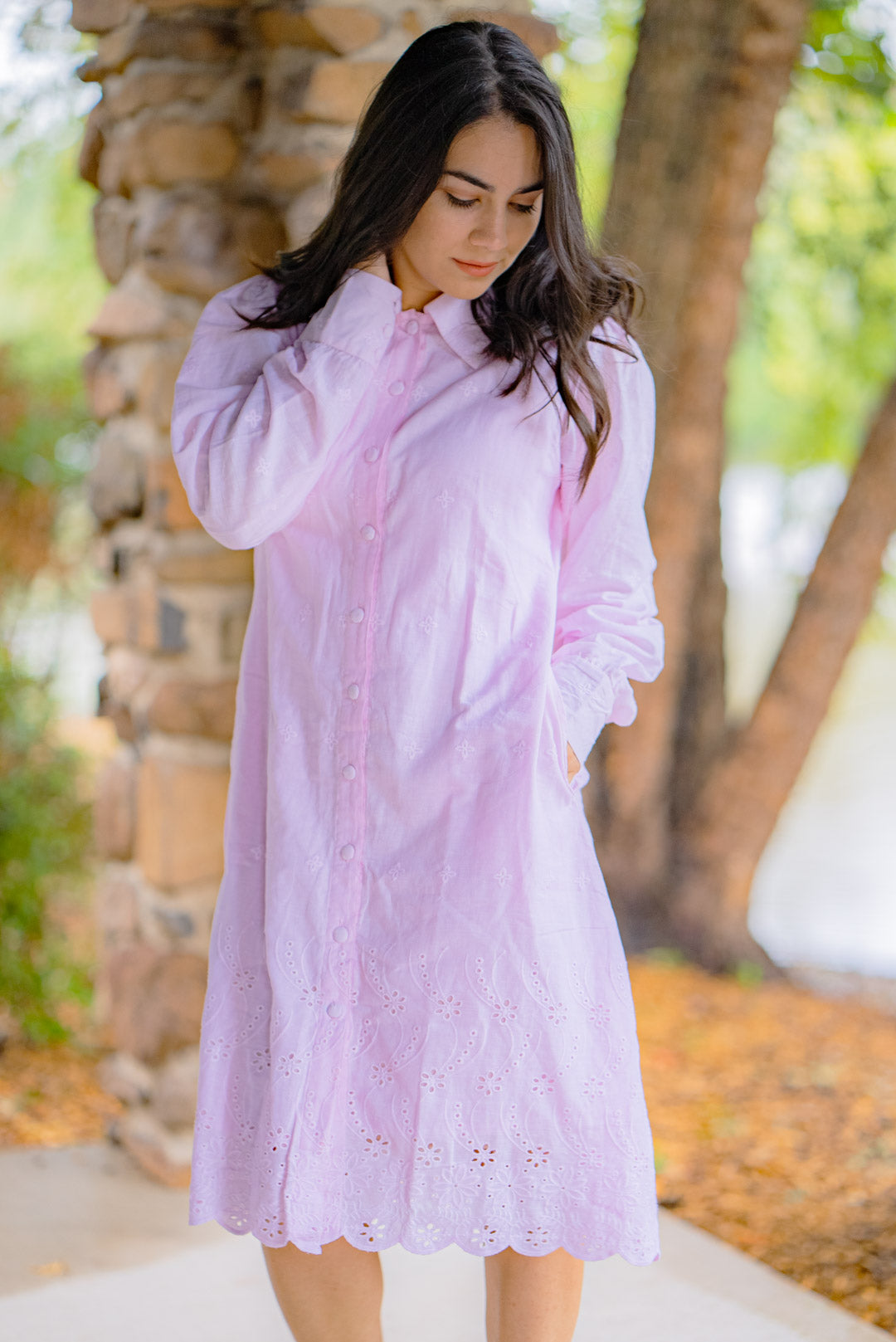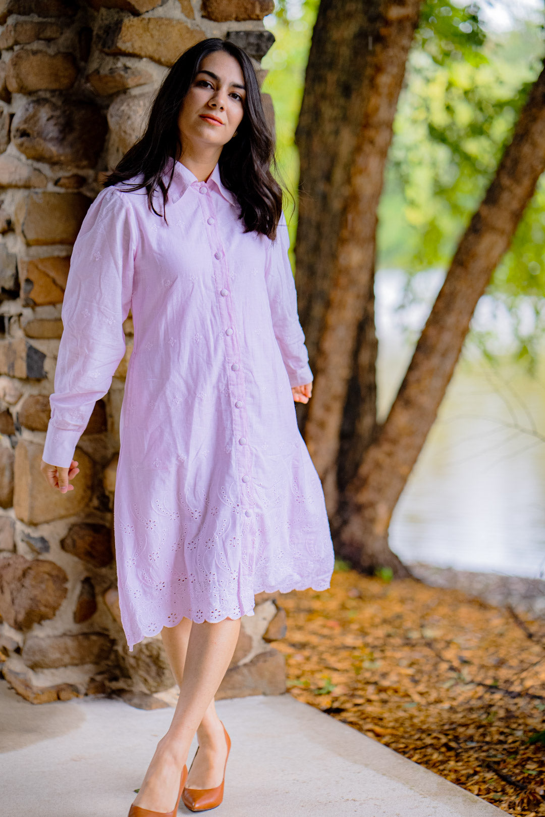 NATALIE KNEE LENGTH SHIRT DRESS | LIGHT PINK EYELET