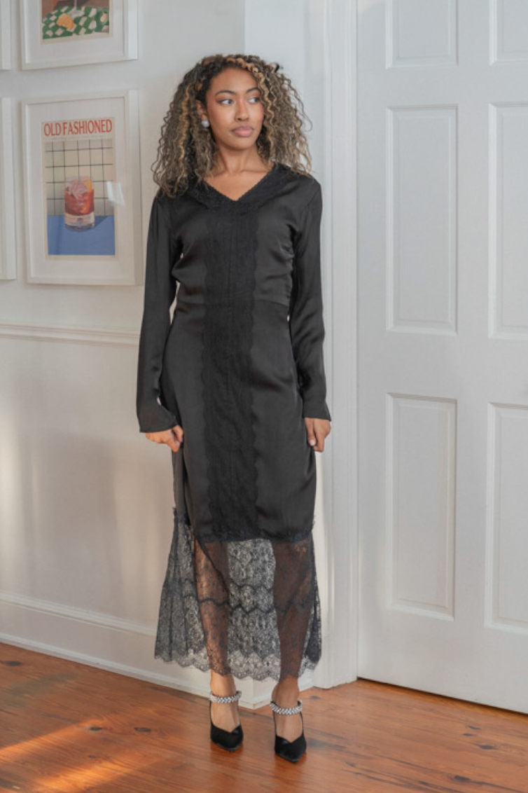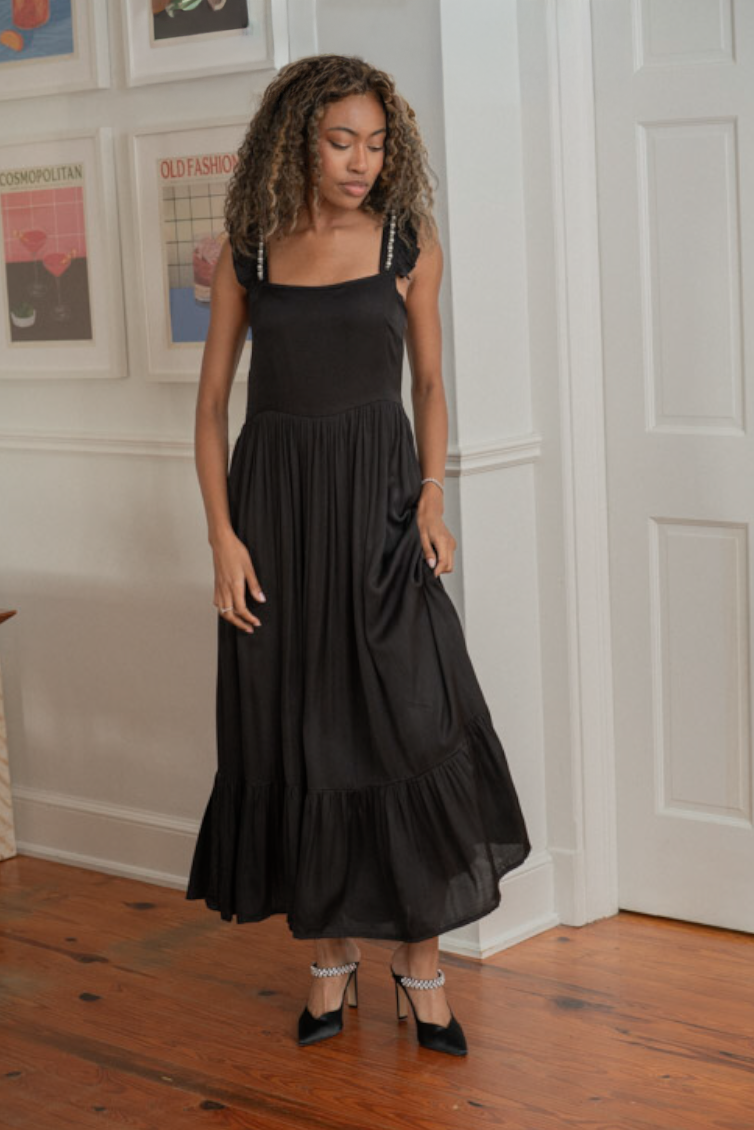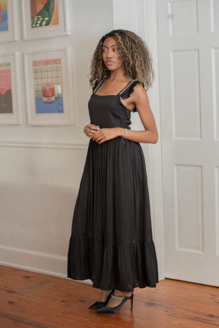 PRE-ORDER: INEZ SATIN RUFFLE MIDI DRESS | NOIR