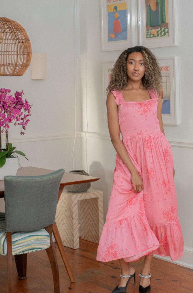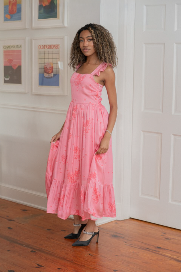 PRE-ORDER: INEZ SATIN RUFFLE MIDI DRESS | PINK BLUSHING GARDEN