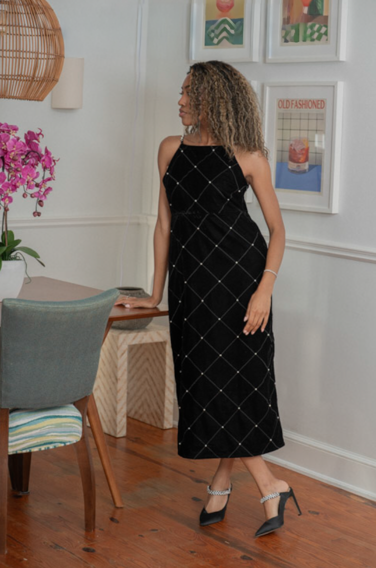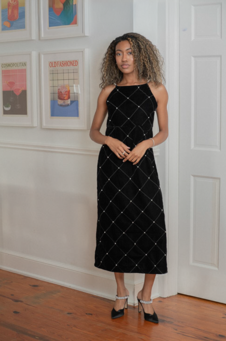 PRE-ORDER: ELIZA VELOUR PEARL EMBELLISHED TAILORED MIDI DRESS | BLACK TWILIGHT