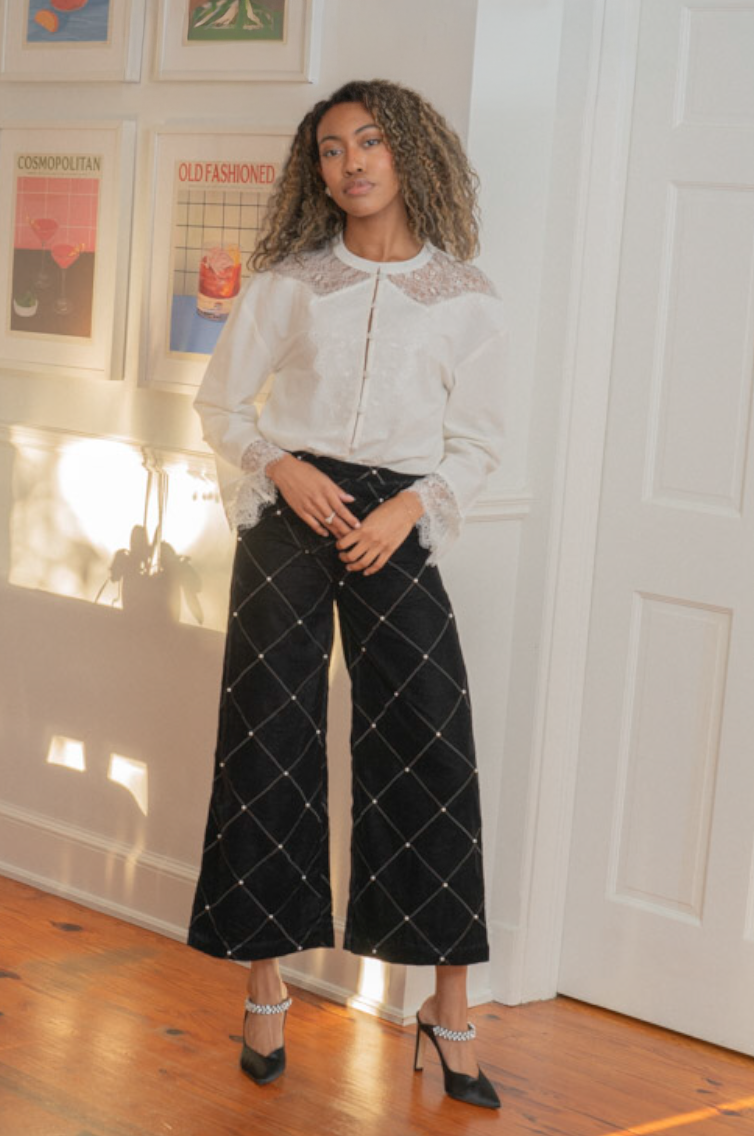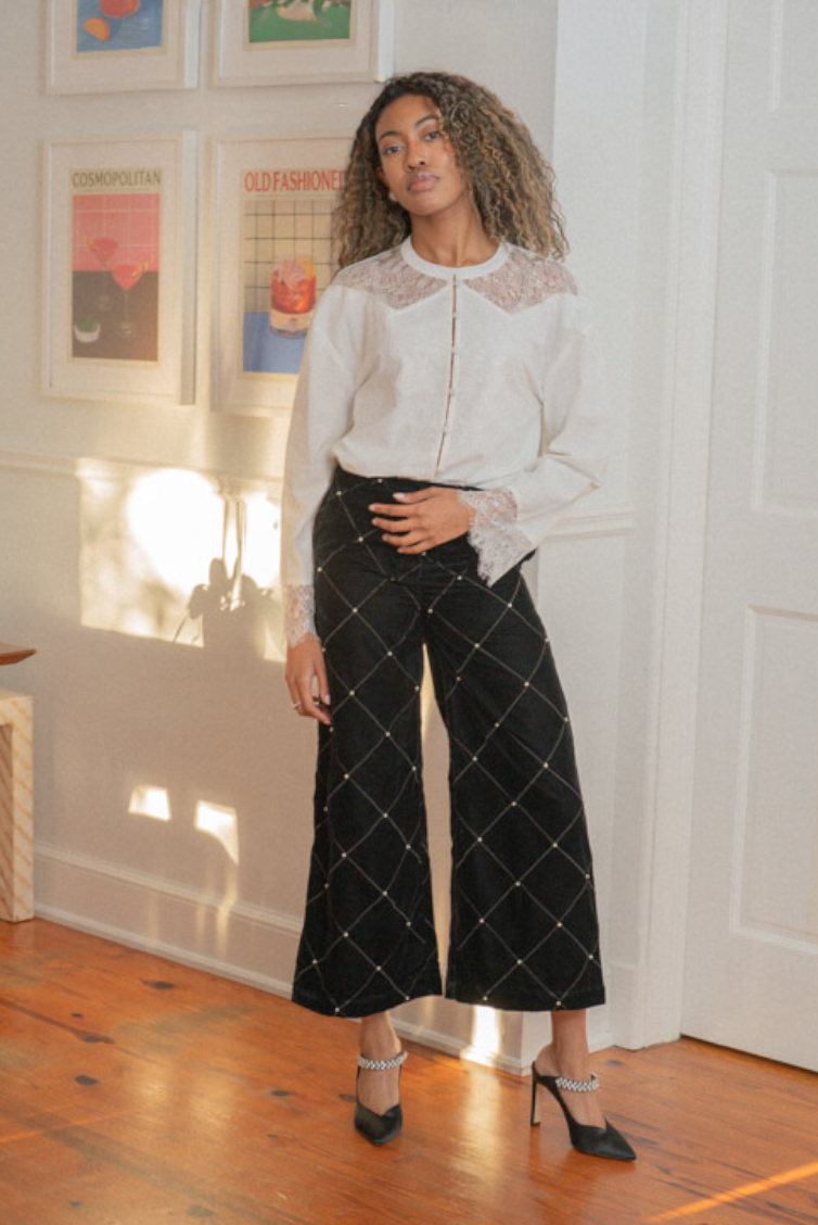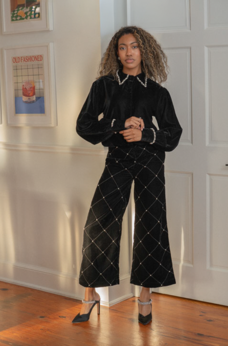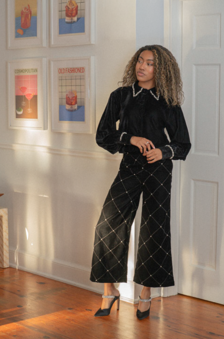 PRE-ORDER: ELOISE WIDE LEG VELOUR PEARL EMBELLISHED PANT | BLACK TWILIGHT