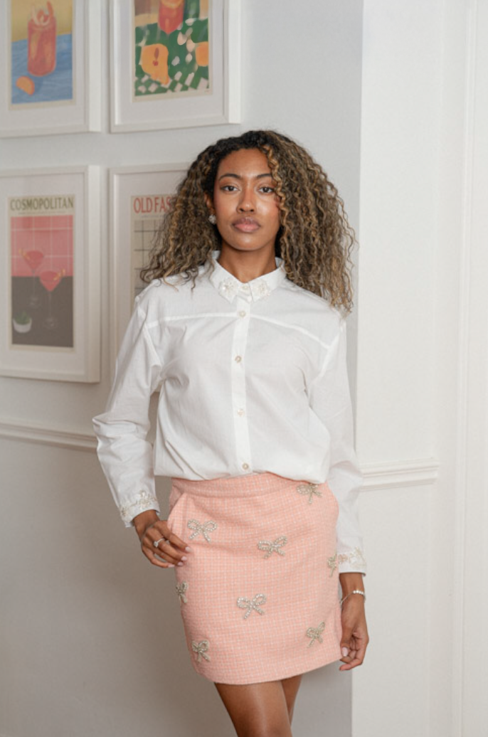 PRE-ORDER: ANNALISE BOW EMBELLISHED TWEED SKIRT | PINK MEMOIR