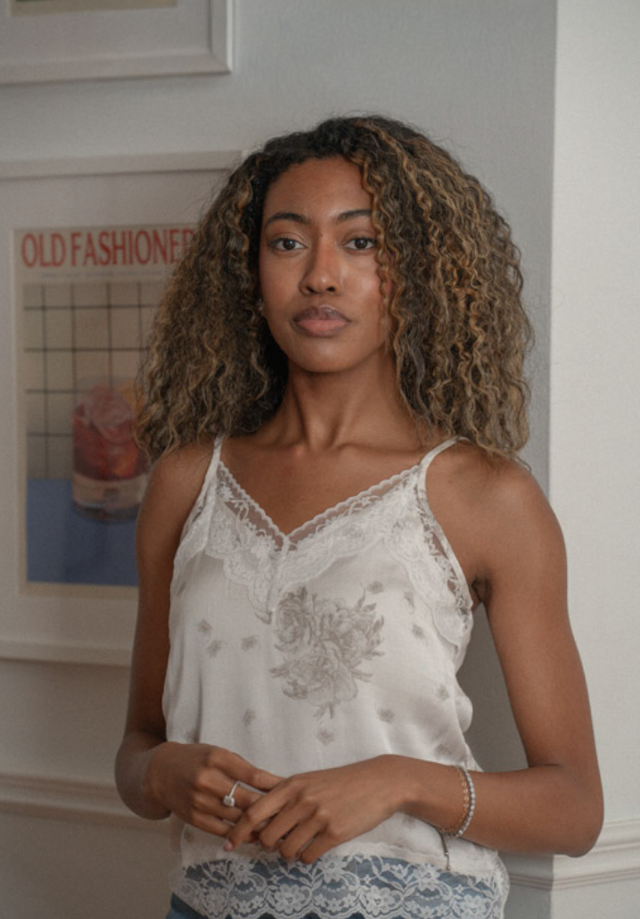 PRE-ORDER: SELMA SATIN AND LACE CAMI TOP | WHITE BLUSHING GARDEN
