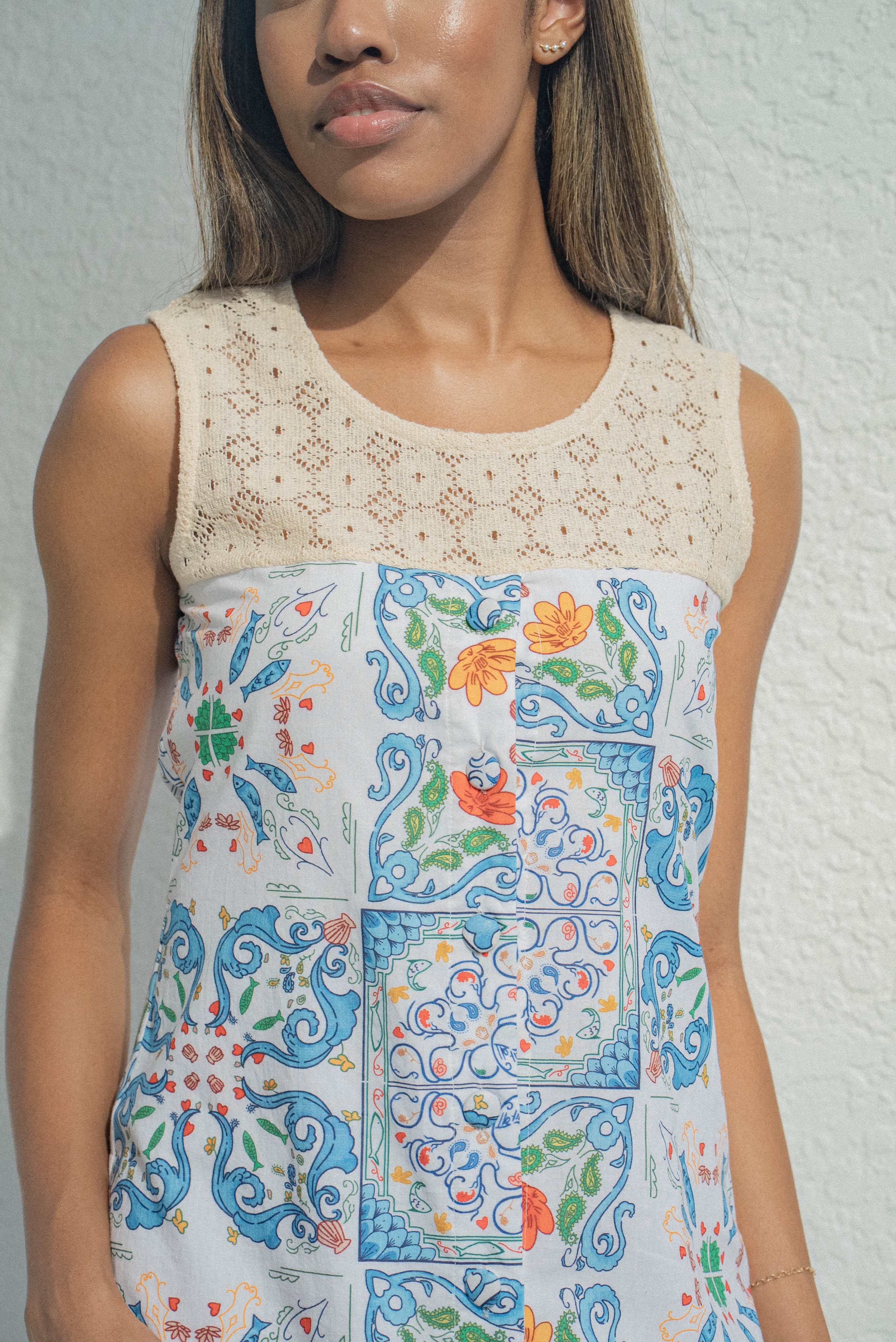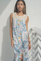 Effortless and refined with a touch of artisanal charm, the Sabrina Dress is designed for warm days and easy elegance. Featuring intricate crochet detailing along the neckline and upper bodice, this sleeveless silhouette blends texture and craftsmanship with a clean, modern shape.