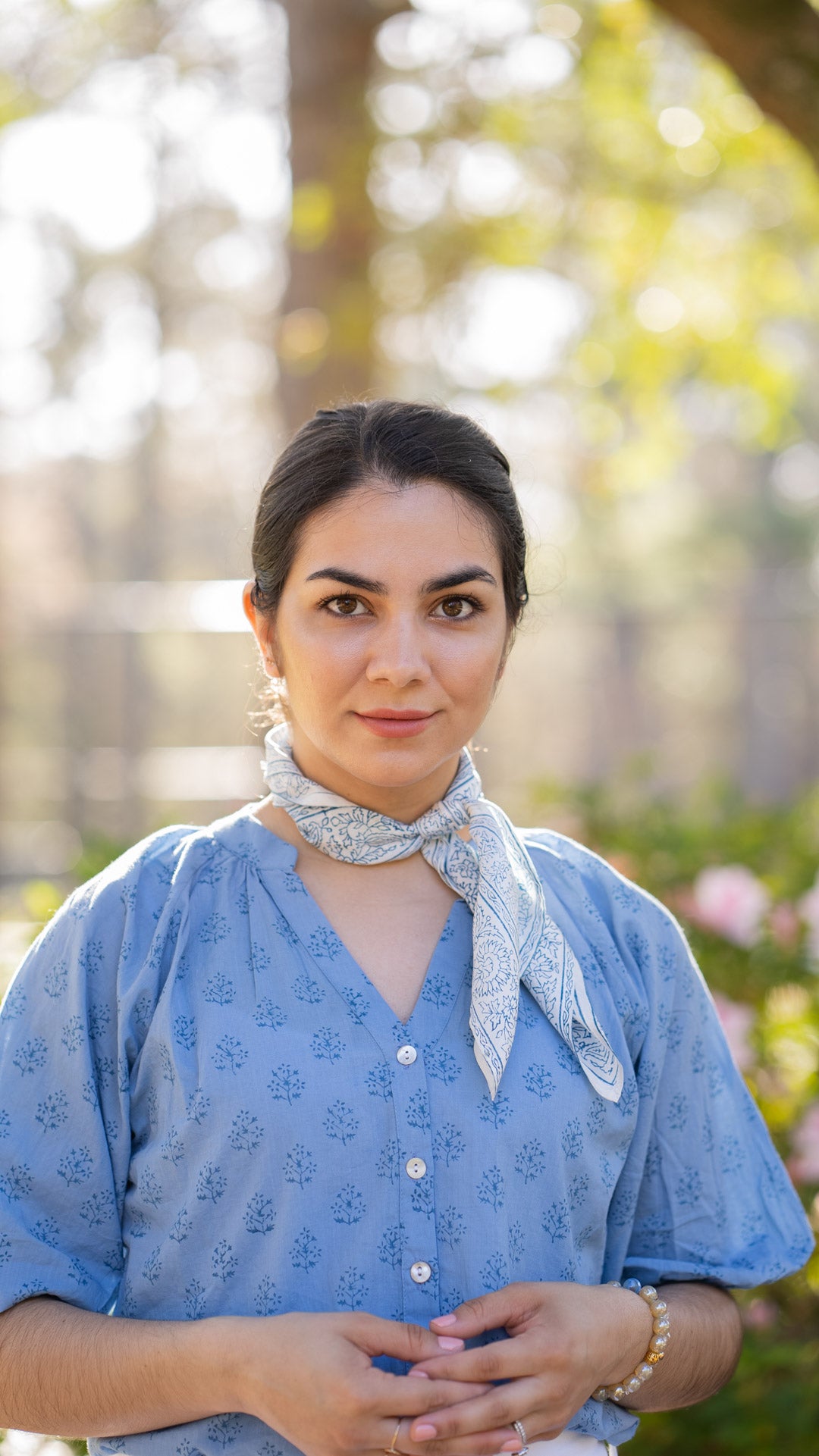 Model is wearing the size 30" x 30" silk scarf.